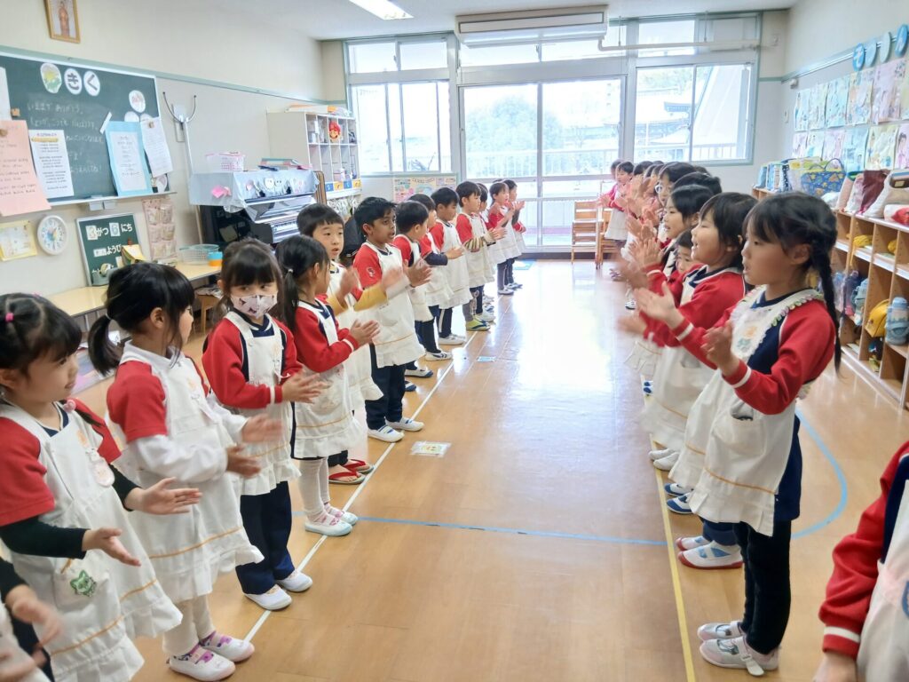 「年中組さん、よろしくね!がんばってね!!」と年長組が伝えると、